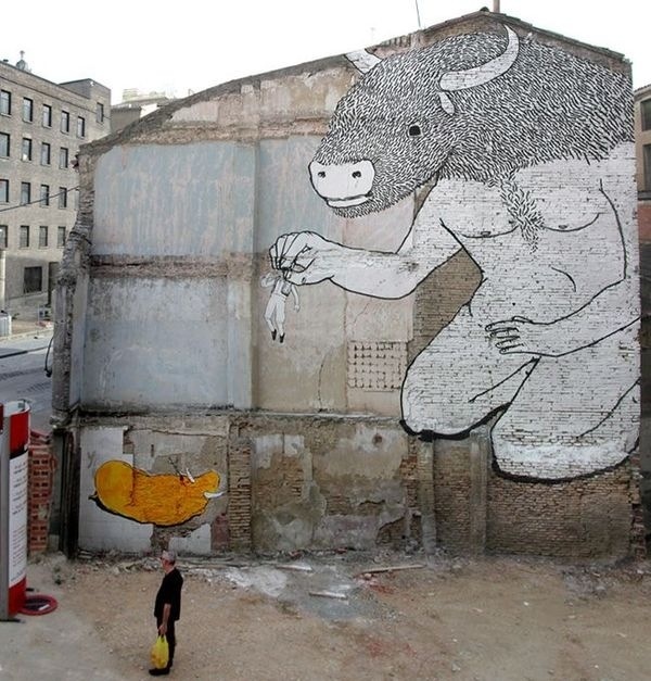 He was easily four storeys tall, made with gallons and gallons of paint. His creator had been a talented artist. Even fixed fast to the wall, the minotaur wriggled with life. His horns came to wicked points, and despite the fixative now coating his body, veins and muscles still pulsed on the brickwork. He must have taken weeks to make, back in the day. In a sense, he was even beautiful.